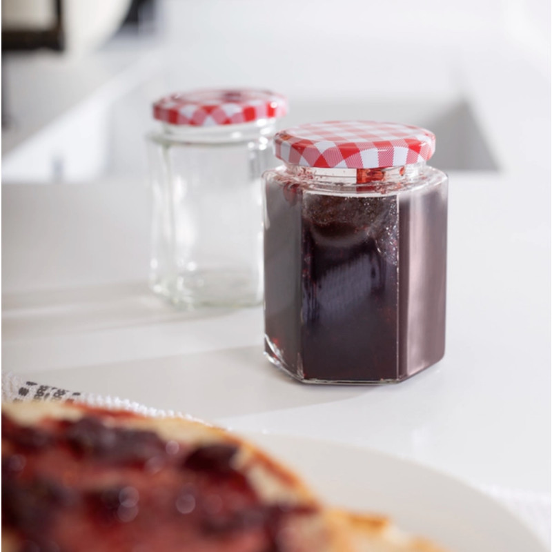 Το βαζάκι γυάλινο για μαρμελάδα με καρώ καπάκι είναι η τέλεια επιλογή για την αποθήκευση σπιτικών μαρμελάδων ή άλλων γλυκών.